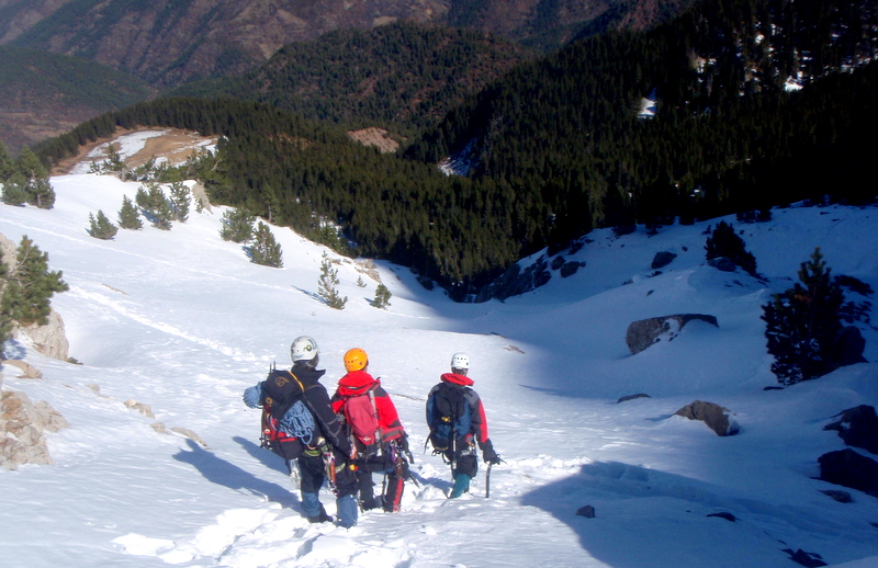 A mesura que pujem i estem arribant a la base del corredor ens trobem una segona cordada. Aquesta ens acompanya un troç més llarg de camí, ja que volen fer la Canal Amagada. L'aproximació a aquesta canal és la mateixa que a l'Ordiguer. Com nosaltres, ells tampoc saben còm estarà la neu a les canals. Ja vorem, encara que pareix que podrem divertir-nos ben molt. Finalment tardem uns cinquanta minuts en arribar a l'inici de la canal. Aquí n'Estorki ens demana si ens encordem o no. Decidim no fer-ho pel moment, continuar pujant i, si és necessari més endavant, ja ens encordarem. La neu està bé i així anirem a un millor ritme, encara que les petjades han desaparescut i les haurem d'obrir nosaltres. Arribem al primer resalt en mixte i el superem sense problemes. Continuem l'ascens disfrutant com a nins petits. És tot marevellós, les vistes, la companyia, el temps assolejat... Arribem a una cruïlla, on la canal es bifurca, la variant de l'esquerra té un bloc on haurem de fer un pas de IV+, així que ens decidim per continuar per la via normal i agafar el camí de la dreta. Més endavant el pendent es fa més fort, arribant als 50-55º, però poc a poc ens la guanyem.