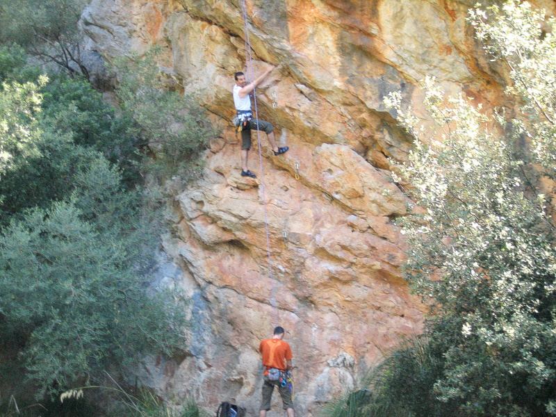 La setmana comença amb un dia d'escalada deportiva a prop de Palma. Arribem a primera hora a peu de vies i comencem sense estorbar-mos gens. Gota a gota arriben més cordades, moltes d'elles formades per estrangers que venen a disfrutar de l'escalada a les parets de la nostra illa. Nosaltres anem fent, donant les nostres primeres passes en aquest mon. Ja haviem escalat un parell de vegades abans, però sempre amb l'atenta mirada de n'Estorki. Sentint que tens la seguretat de que hi ha una persona experimentada vetllant per nosaltres. Aquesta vegada ho feim tot sols!!