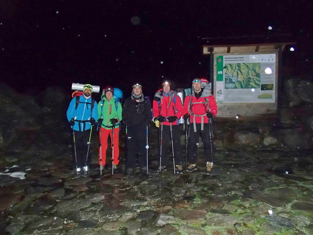 Ens despertem a les quatre i mitja del dematí. Després de berenar comencem a caminar sense llum. Ha plogut durant tota la nit, encara que quan comencem a caminar nosaltres només hi ha una petita nevada, però res que molesti gaire. La neu està més dura que ahir, fent que aquest primer tram sigui menys pesat. Desfem el camí de l’anada alternant-nos a reobrir la petjada entre en Xavi, n’Estorki, el meu germà i jo. En poc temps arribem a sa Font des Barrerons. És cert que ens sorprèn la gran quantitat de neu que ha desaparegut durant la nit. Hi ha un desgel brutal, amb una quantitat d’aigua corrent cap a la llacuna. Quan arribem al cartell encara hi ha poc llum, i a més entra novament boira. Ens costa un poc arribar a trobar un petit cartell intermig entre el que hem passat i la zona plana dels Barrerons, però finalment ho fem. Des d’aquí a la Font del Cavadors on ens aturem per fer un foto tots plegats.