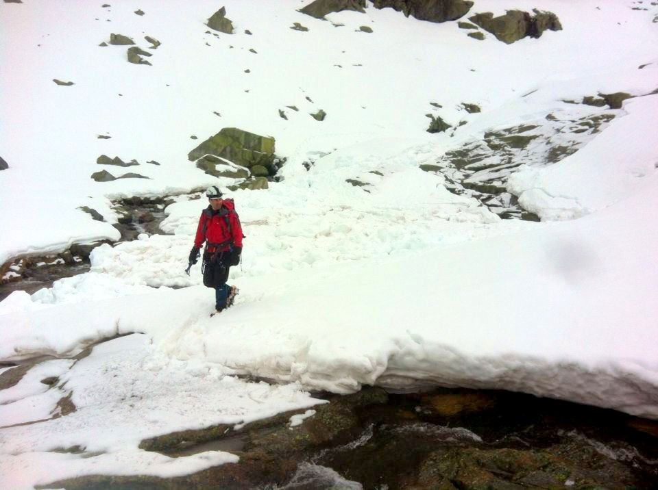 Després de berenar, i veient que l’estat de la neu no ens permet tirar cap a l’Almanzor (2.591 m), decidim fer un dels corredors que tenim més a prop del refugi. Just abans de partir arriba un muntanyer amb esquís amb qui parlem una estona. És un al·lot que es coneix la zona i ens confirma que millor no tirar cap a l’Almanzor, ja que la neu està amb molt males condicions. Li expliquem les nostres intencions i ens comenta que el corredor que tenim pensat fer és la Canal de las Hoyuelas. Ens clarifica la ruta, el camí de retorn i ens acomiadem d'ell després de parlar una estona.